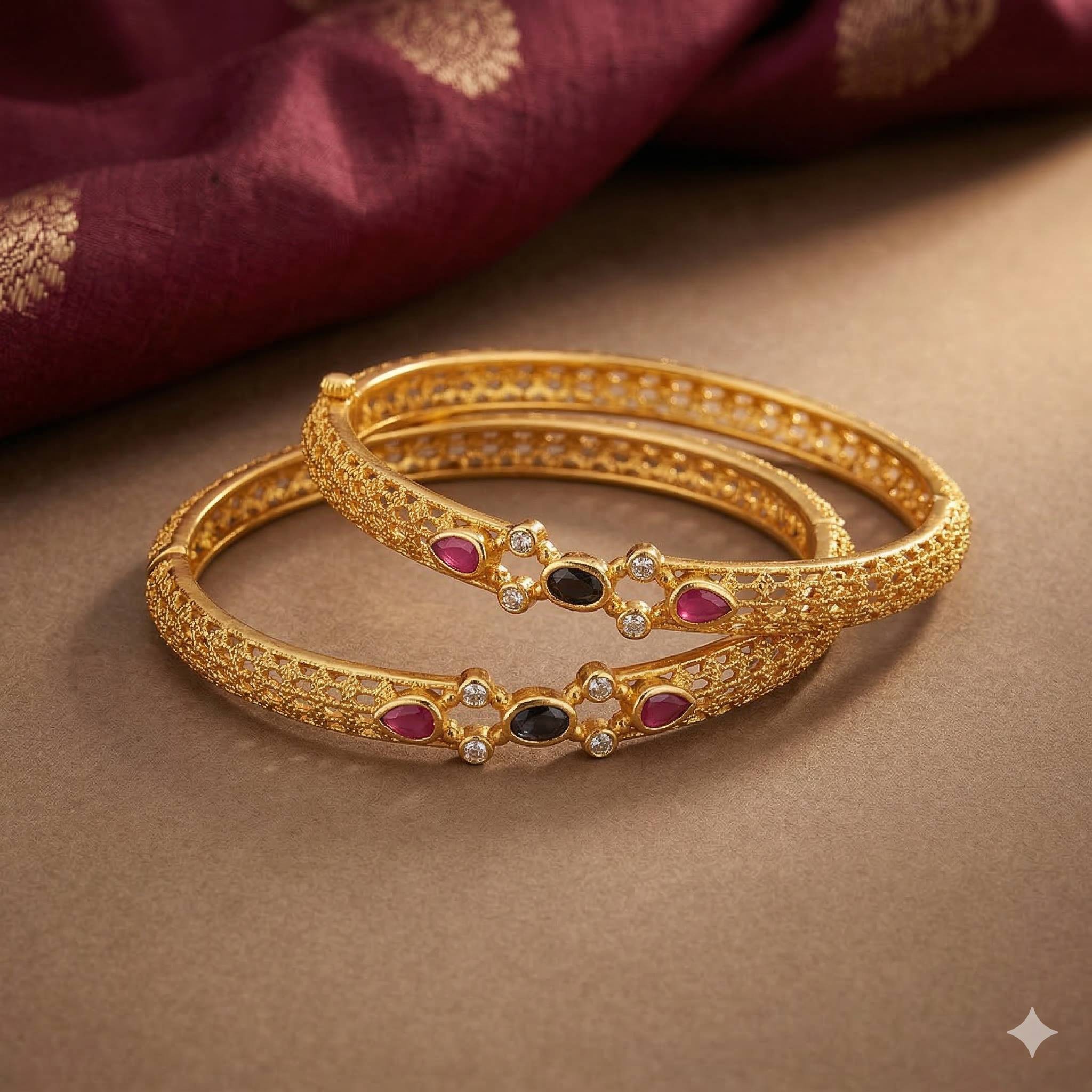 The central motif of each bangle is a meticulously crafted “”panchratna”” style arrangement, showcasing a vibrant collection of gemstones. Three pear-shaped ruby red stones are set amidst five brilliant-cut clear cubic zirconia diamonds, surrounding a polished oval sapphire blue center stone. This timeless design is both elegant and eye-catching.