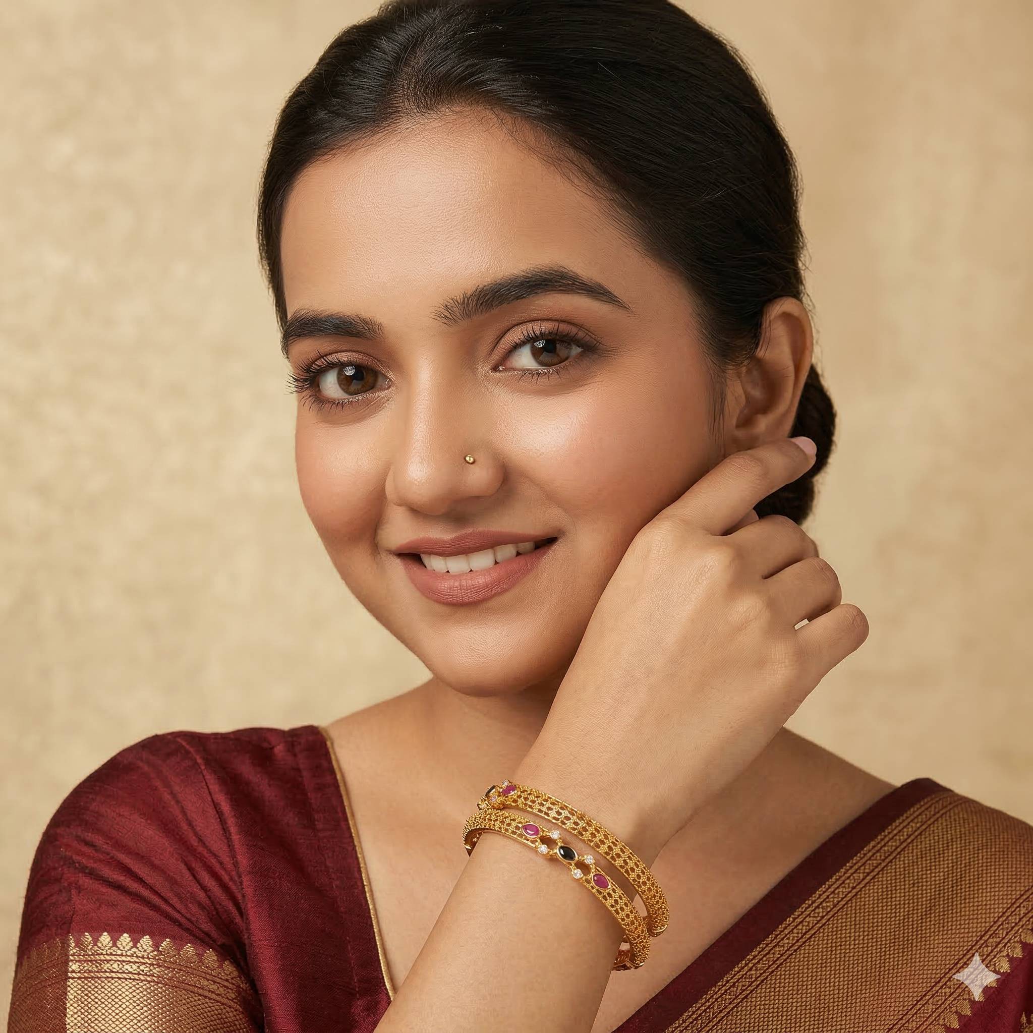 These traditional Indian bangles are perfect for special occasions like weddings, festivals, and family celebrations. Their vintage-style gold plating is designed to complement classic sarees, lehengas, and other traditional wear. Durable and designed for comfort, these bangles are a must-have addition to any woman?s luxury fashion jewelry collection.”