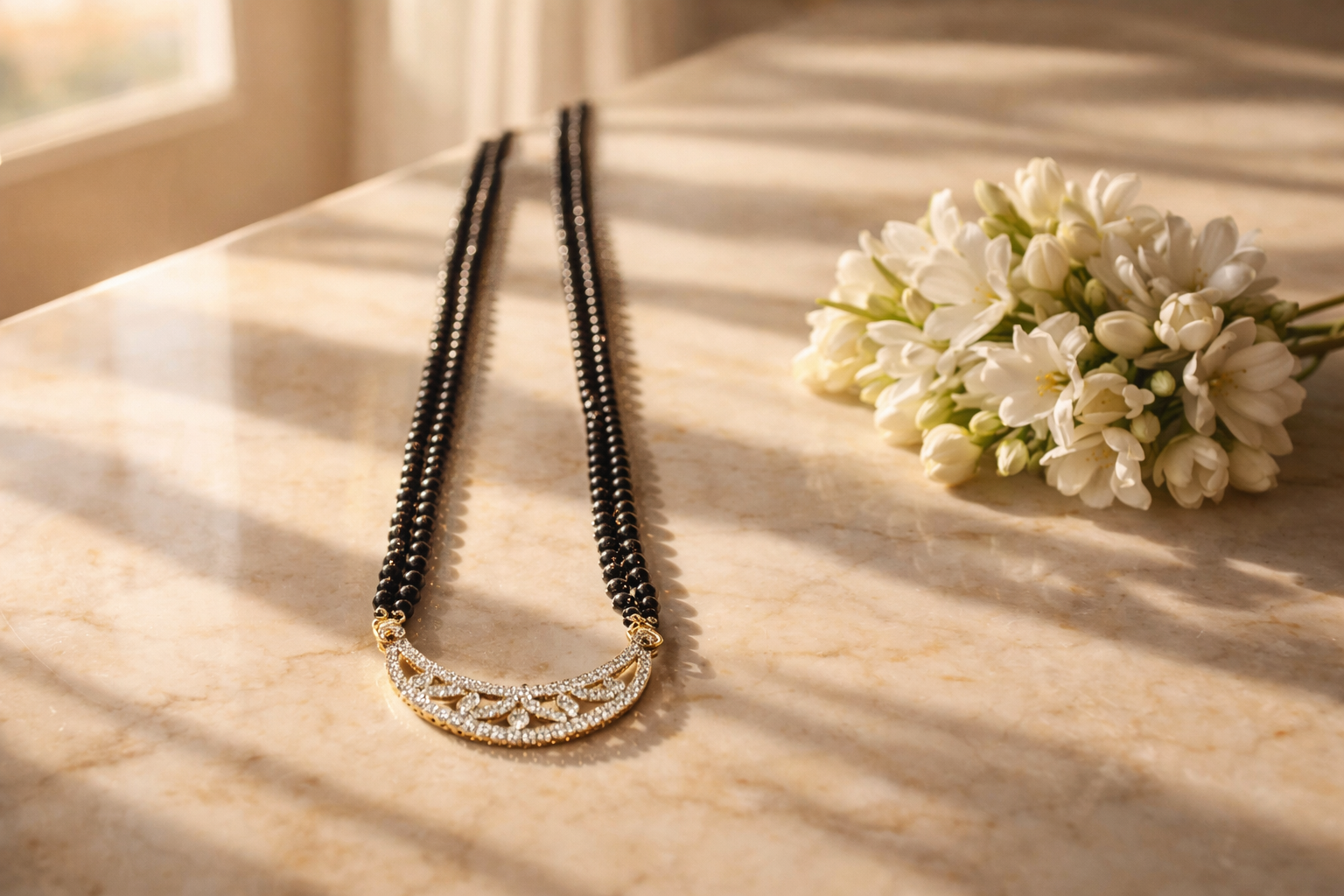 Embrace the perfect blend of tradition and modernity with our Crescent Moon Diamond Studded Mangalsutra.