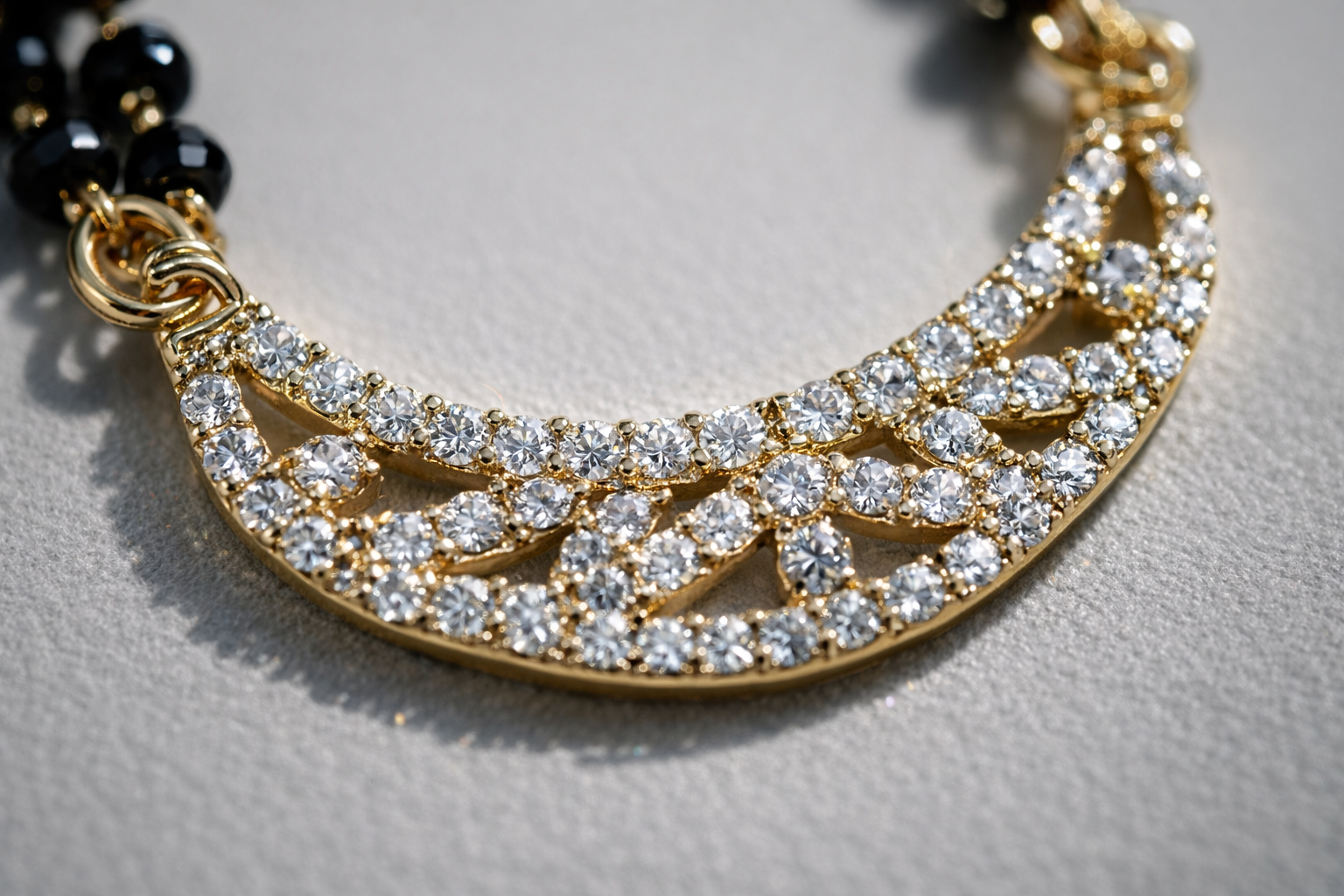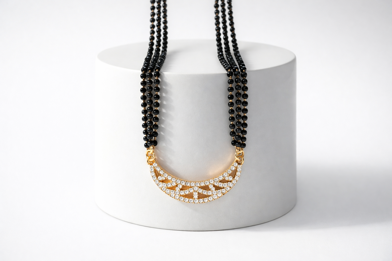 Embrace the perfect blend of tradition and modernity with our Crescent Moon Diamond Studded Mangalsutra. Inspired by the auspicious Chandrakor design, this piece features a gracefully curved crescent pendant adorned with brilliant, pave-set American Diamonds that capture the light with every move.