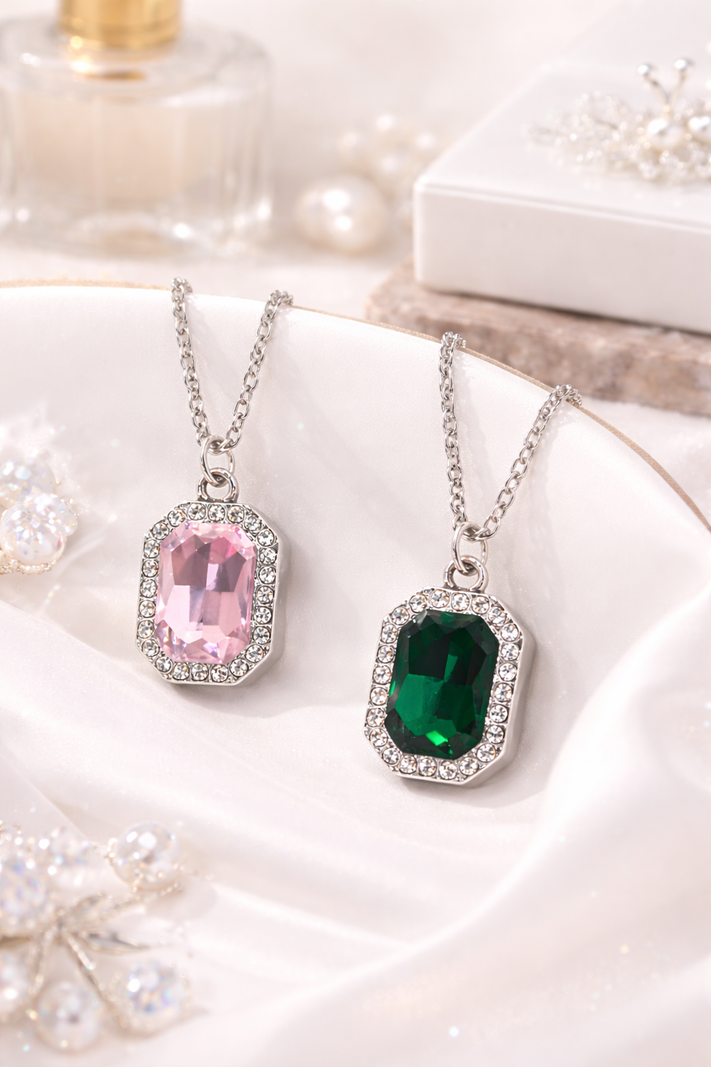 Add a touch of elegance to your look with this beautifully crafted crystal pendant necklace. Designed with a rectangular-cut stone surrounded by subtle detailing, this necklace offers a refined and modern appeal.