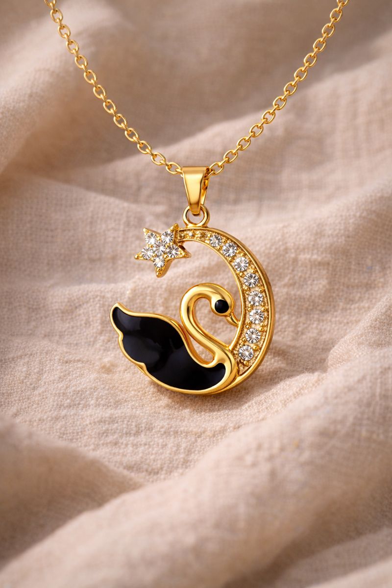 Graceful gold-tone pendant necklace designed with an elegant swan-inspired motif resting within a crescent moon shape. The pendant features fine crystal detailing along the curved moon, adding a soft sparkle, while the contrasting dark accent enhances the design depth. The smooth gold-tone chain complements the pendant beautifully, making it suitable for daily wear, festive occasions, parties, and evening outings. Lightweight and stylish, this necklace adds charm and sophistication to any outfit and makes a lovely gifting choice for special moments.