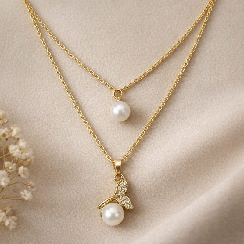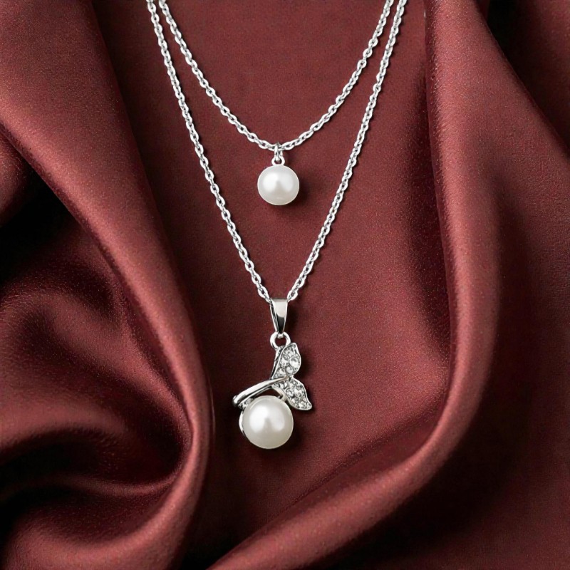 Elegant pearl leaf pendant necklace with a double-chain design, available in Silver and Gold variants.